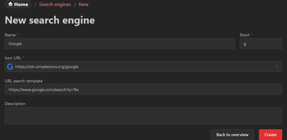 The template must be a valid URL that incldues the %s placeholder. Example for Google: https://www.google.com/search?q=%s Homarr will replace the %s with the term that the user entered.